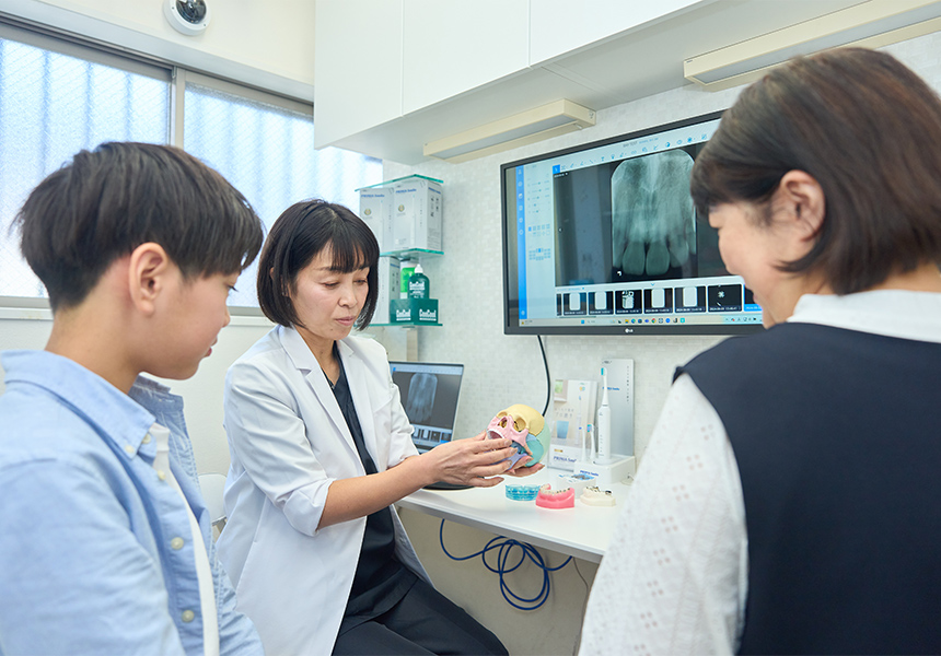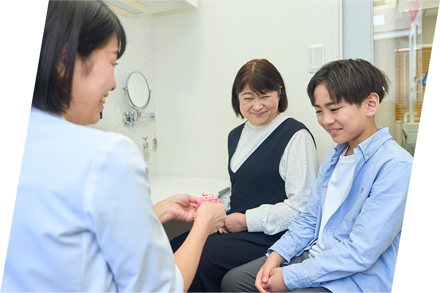当院の小児矯正は、治療経験豊富な女性歯科医師の「あゆみ先生」が、親御さんの気持ちに寄り添いながら担当します。医院全体で、親子での負担を減らして適切な治療をご提案いたします。