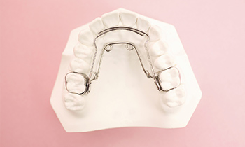 歯の裏側(舌側)に沿わせて装着する、目立ちにくいワイヤー装置です。主に奥歯に固定し、永久歯が生えるためのスペースを確保したり、歯列の幅を維持したりするために使用します。